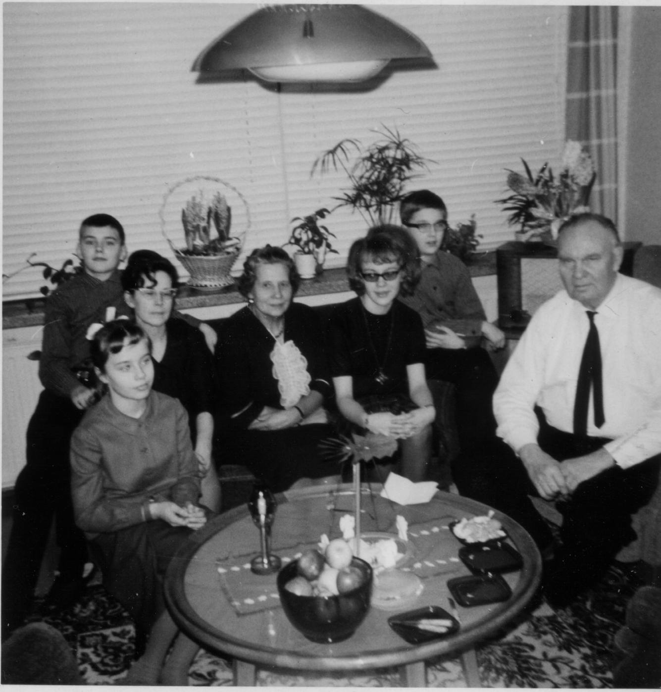 Matti, Marja, mummi, Helmi-täti, Tytti, Olli ja Artturi Tammilehto vuoden 1964 alussa