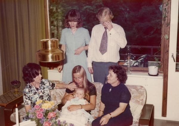 Kerttu-mummi, Tytti, Marja, Oskar, Åge ja Kirsti-täti Oskarin ristiäisissä elokuussa 1974